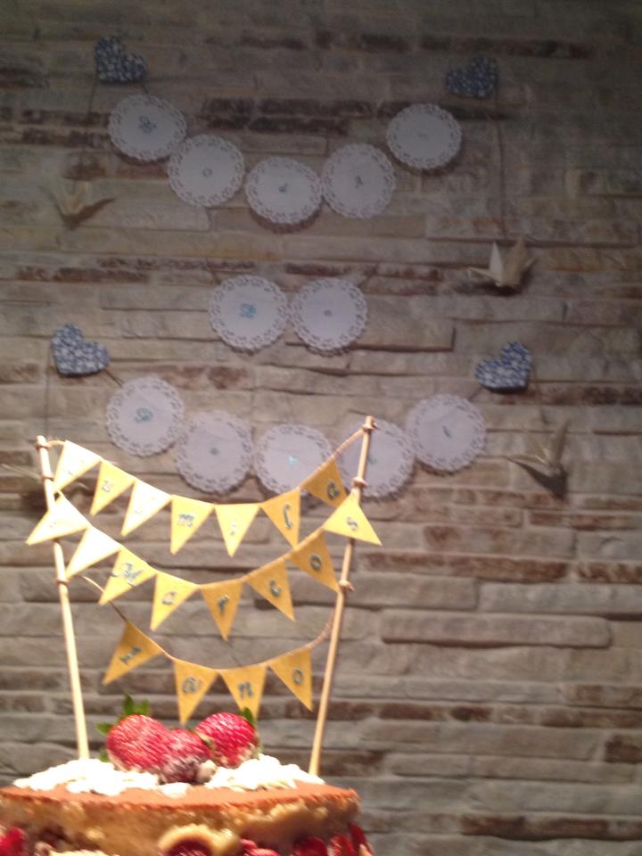 Escolhi as cores amarelo, azul, marrom e branco, por serem as cores de coisas que eu já tinha aqui em casa. Usei a renda que sobrou do convite do meu casamento, papéis de cores diferentes, fiz uns tsurus de origami, usei as forminhas que guardei do casório da minha irmã, umas toalhinhas de papel rendado que eu já tinha e pronto, assim foi feita toda a decoração!